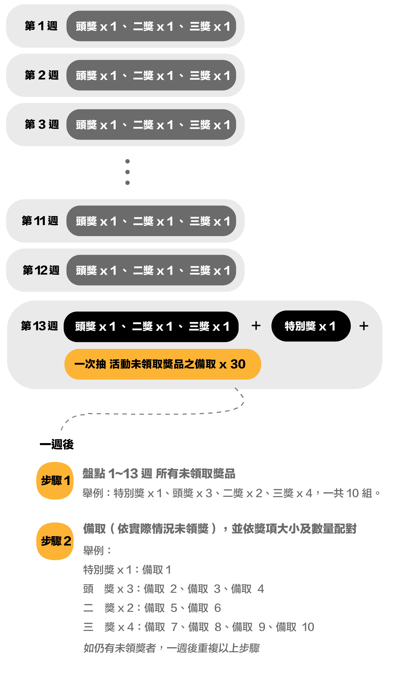4/11 至 7/4 每週五抽獎,共 13 週,最後一週(7/4)額外抽特別獎。